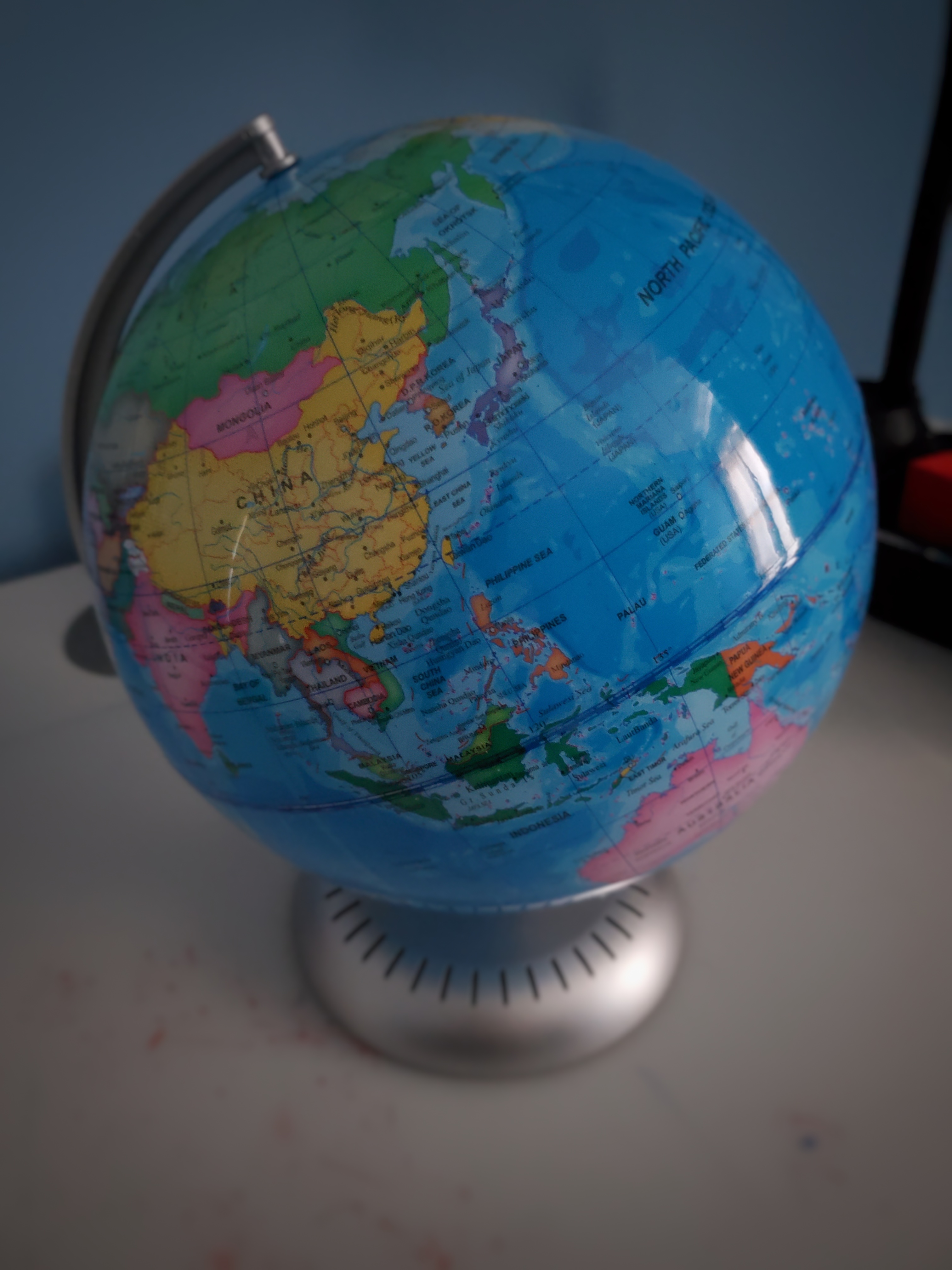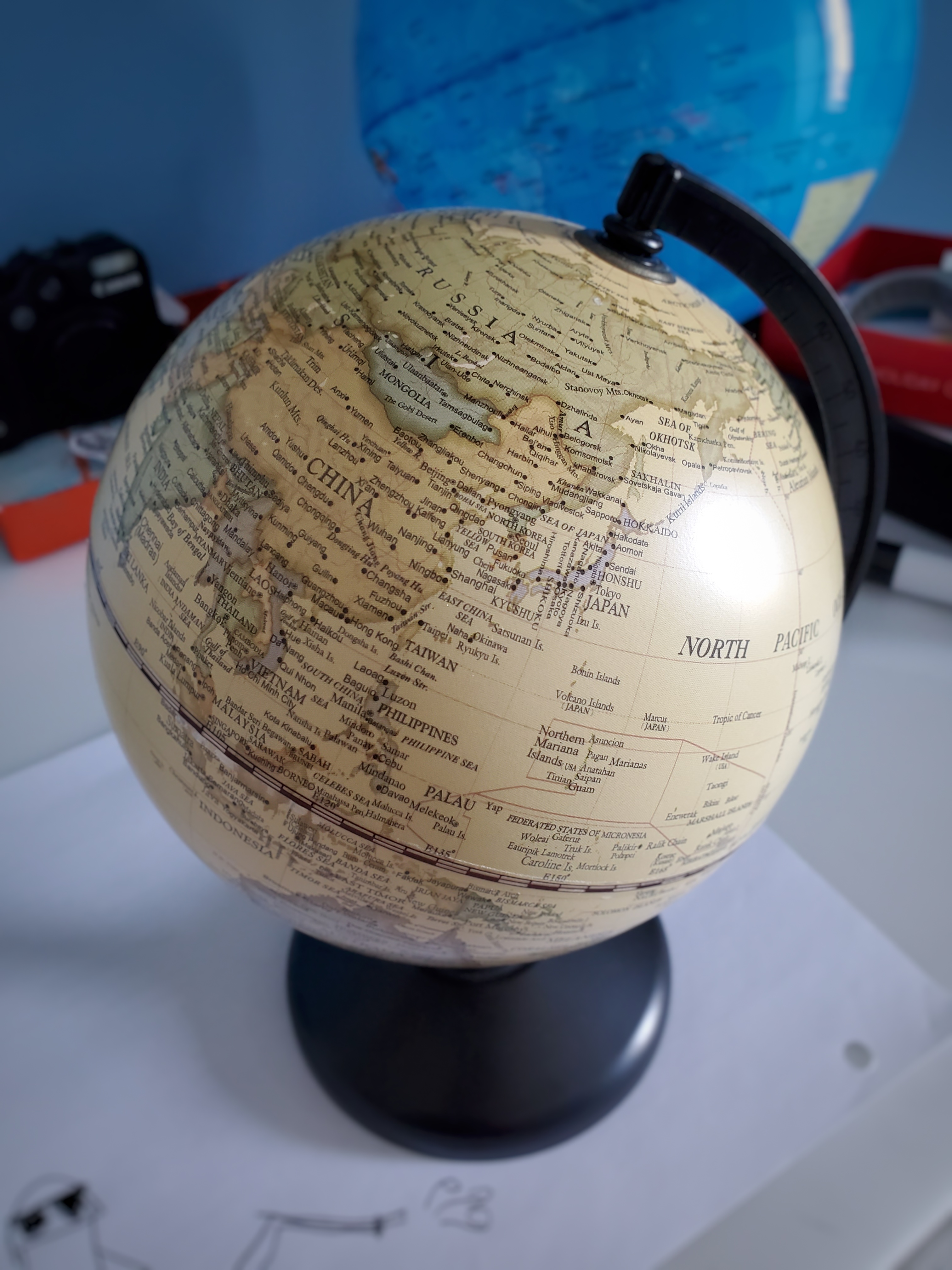 어릴적 기억이 거의 안 날 정도의 나이를 먹은 지금도 부모님에게 지구본을 받은 기억이 아스란히 남아있다. 그때는 집에 있는 (평면) 지도를 보거나 책에 나와있는 작은 지도로 우리 나라가 중국과 일본 사이에 있는걸 알수있던 시기였던 1980년대 ㅎㅎ (뇐네인증) 어떤 이유였는지 누가줬는진 정확하게 기억이 안나지만 부모님에게 받은것 같은 느낌이 기억에 남아있어서인지 그냥 부모님이 주셨겠거니 하지만 그 당시 이모나 삼촌들이 자주 우리집에 왔었기에 엄청 헷갈린다. 옇튼 각설하고 그날 지구본을 하루종일 보면서 처음 찾은게 우리나라였는데 그때 받은 충격은 ㅎㅎ 이렇게 작은 나라에 내가 살고 있구나였다. 그러다 TV에서 보고 들었던 나라들을 하나하나 찾아보면서 즐거워하던게 생각나고 공 굴리듯 굴리다 책상에서 떨어뜨려서 지구본에 크랙이 생겨 울었던것도 같고... 다 내 어릴덕 기억이자 추억.